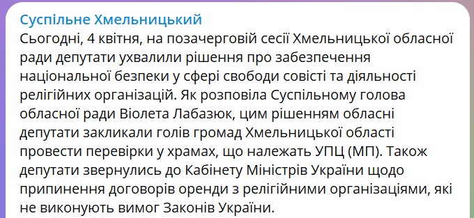 Депутаты Хмельницкого облсовета призвали местные громады провести проверки во всех храмах УПЦ в области, а Кабмин - разорвать договора аренды с религиозными организациями, "не выполняющими требования Законов Украины".
