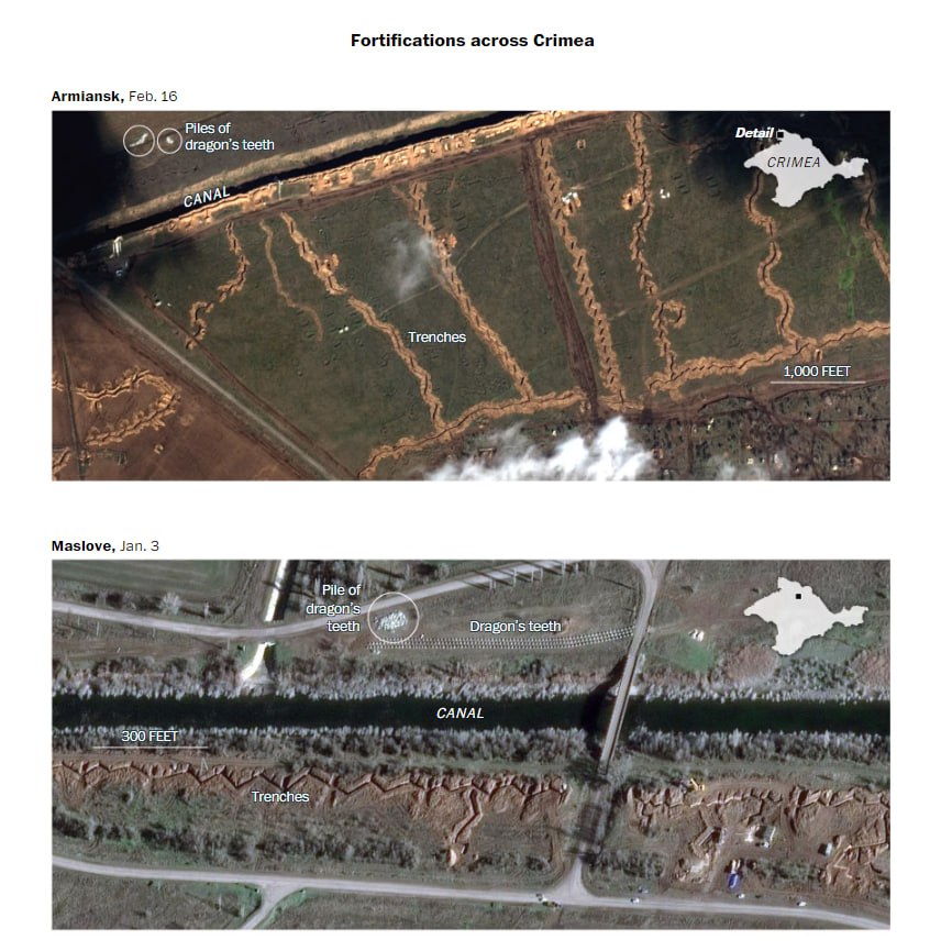 Washington Post также публикует снимки, на которых видны окопы близ села Медведевка на севере Крыма, которые появились "после нескольких недель земляных работ".