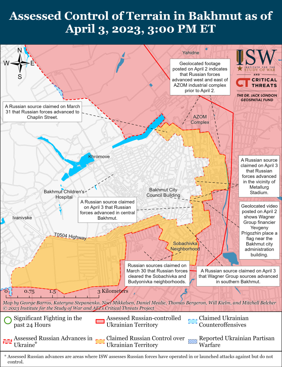"Группа "Вагнера", вероятно, продолжит попытки консолидировать контроль над центральным Бахмутом и попытается продвинуться на запад через плотные городские районы в направлении Хромово", - делают вывод эксперты.