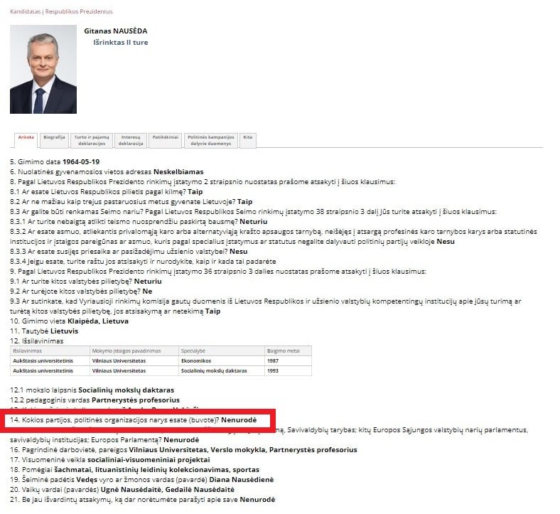 Президентская служба этот факт подтвердила, но отметила, что в деятельности партии Науседа не участвовал, пишет Delfi. В анкете кандидата этой информации не было, поскольку эта информация не является обязательной.
