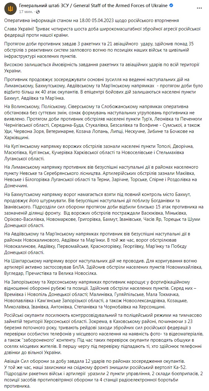 3. На Бахмутском направлении враг пытается взять под полный контроль город Бахмут, продолжает его штурмовать. Также, оккупанты вели безуспешные наступательные действия в районе Богдановки Донецкой области. Подразделения сил обороны в течение суток отразили около 30 атак противника на указанном участке фронта.