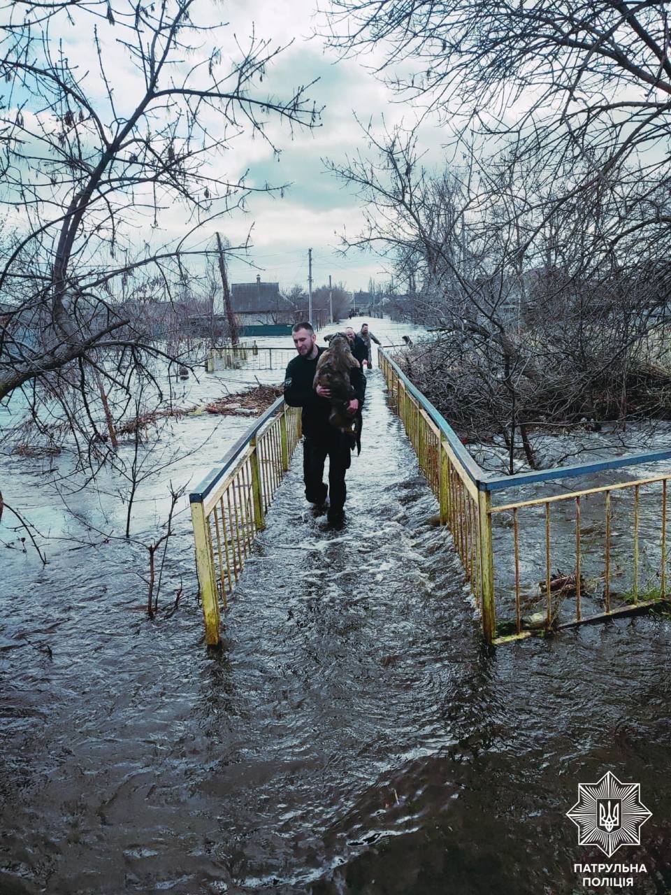 Полицейский спасает пса из водяной ловушки. Видно что уровень воды поднялся настолько высоко, что затопил пешеходный мостик, На фоне видна панорама залитого водой частного сектора.