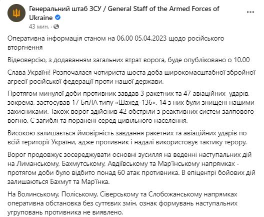 1. За прошедшие сутки противник нанес 3 ракетных и 47 авиационных ударов, применил 17 беспилотников типа "Шахед-136". 14 из них были уничтожены. Также враг совершил 42 обстрела из реактивных систем залпового огня. Есть погибшие и раненые среди гражданского населения.