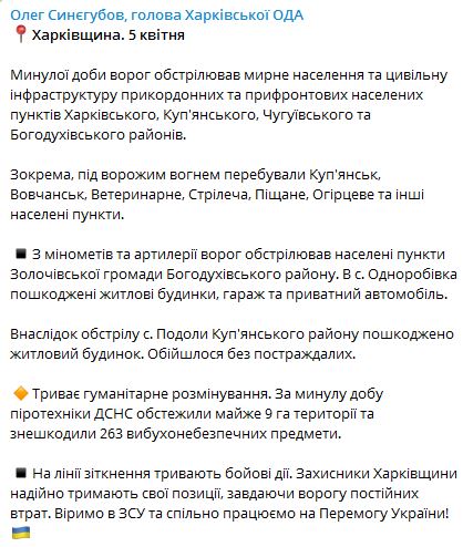 08.50 За минувшие сутки враг обстреливал мирное население и гражданскую инфраструктуру приграничных населенных пунктов Харьковской области. Речь идеи о Харьковском, Купянском, Чугуевском и Богодуховском районах.