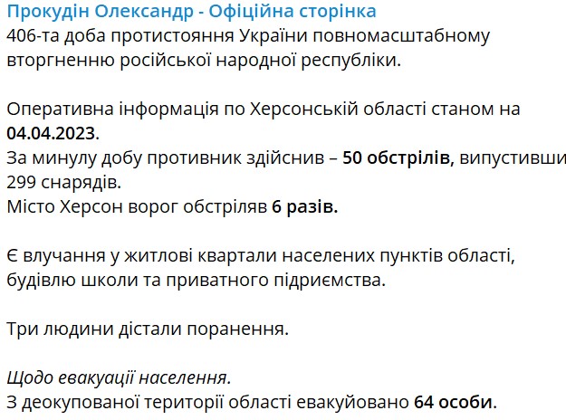 Об этом сообщает глава Херсонской ОВА Александр Прокудин в своем телеграм-канале.