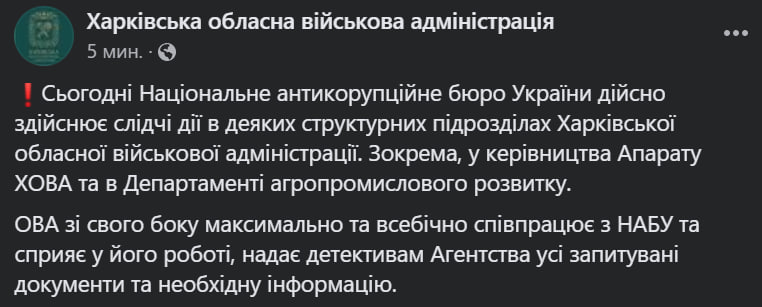Но Харьковская ОВА уже разместила заявление о том, что "идут следственные действия в некоторых структурных подразделениях Харьковской областной военной администрации".
