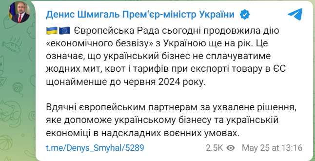 "Европейский совет принял решение продлить действие так называемого "экономического безвиза" с Украиной еще на год. Это означает, что украинский бизнес сможет продолжать экспортировать товары в Европейский союз без уплаты пошлин, квот и тарифов как минимум до июня 2024 года", - написал Денис Шмыгаль.