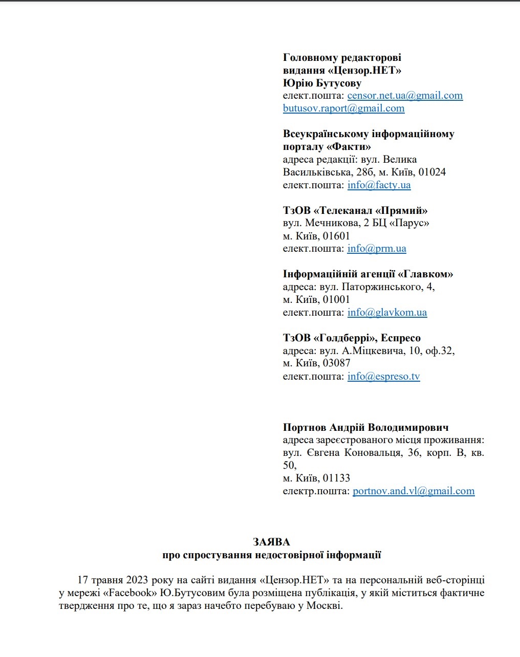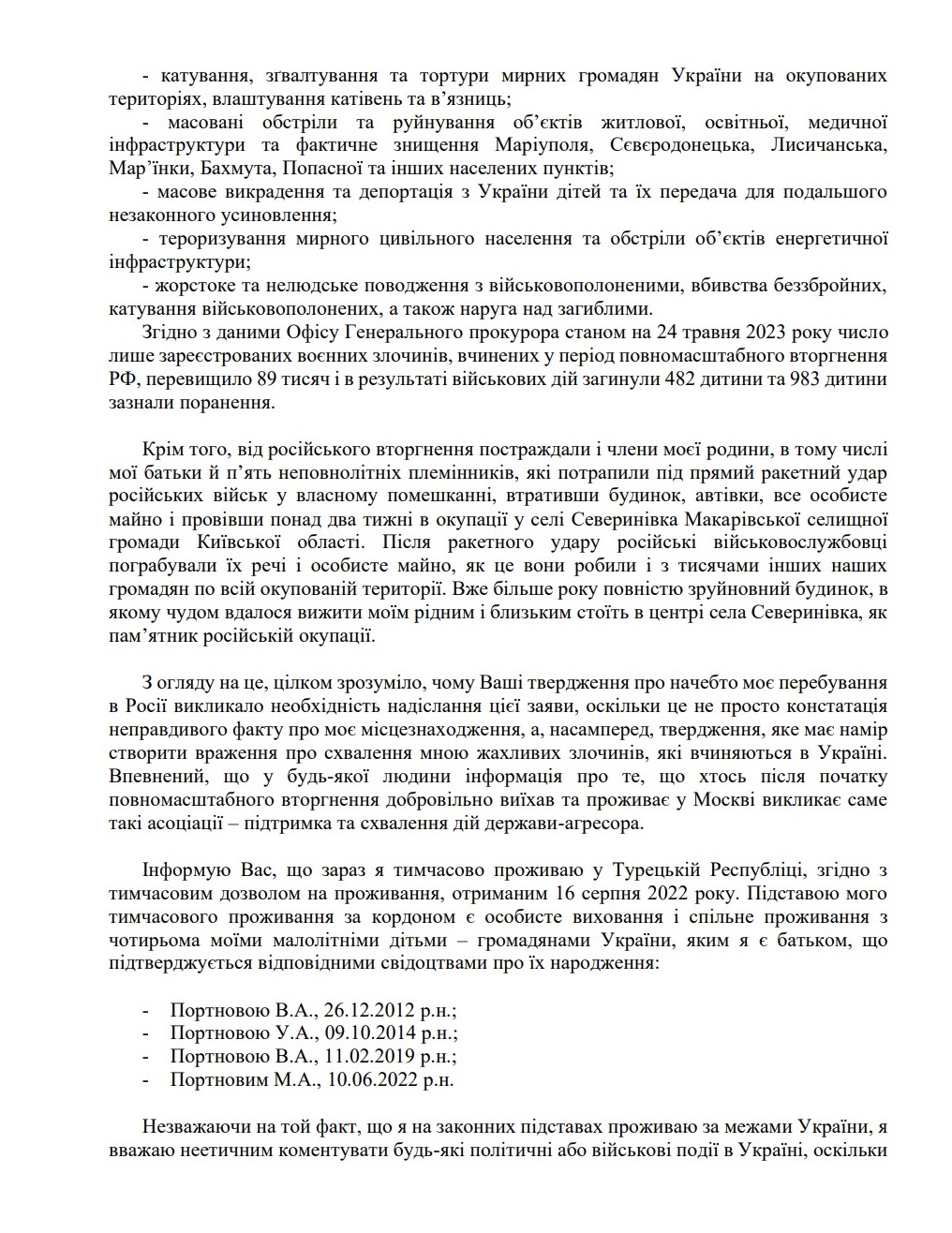 "Моя позиция известна сотням людей, с которыми я ежедневно общаюсь: я считаю, что президент РФ, российские чиновники, российские войска и граждане РФ совершили и продолжают совершать в отношении нашего государства и граждан ужасные военные преступления", – заявил Портнов.