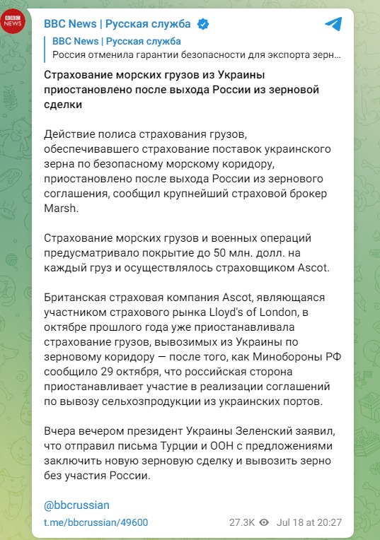 Сообщается, что действие полиса страхования грузов, обеспечивавшего страхование поставок украинского зерна по безопасному морскому коридору, приостановлено после выхода России из зернового соглашения.