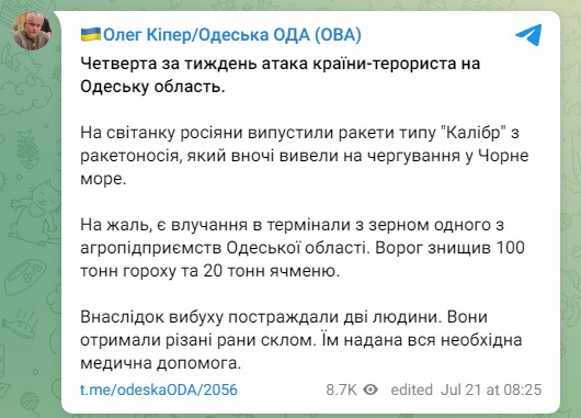 "К сожалению, есть попадание в терминалы с зерном одного из агропредприятий Одесской области. Враг уничтожил 100 тонн гороха и 20 тонн ячменя. В результате взрыва пострадали два человека. Они получили резаные раны стеклом. Им предоставлена вся необходимая медицинская помощь", - сказано в посте.