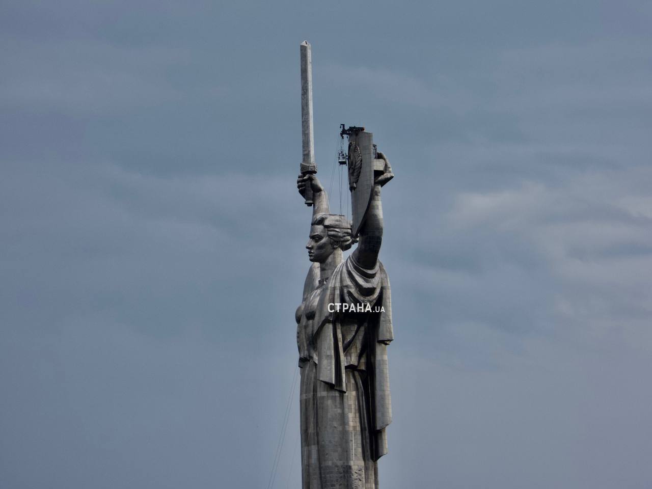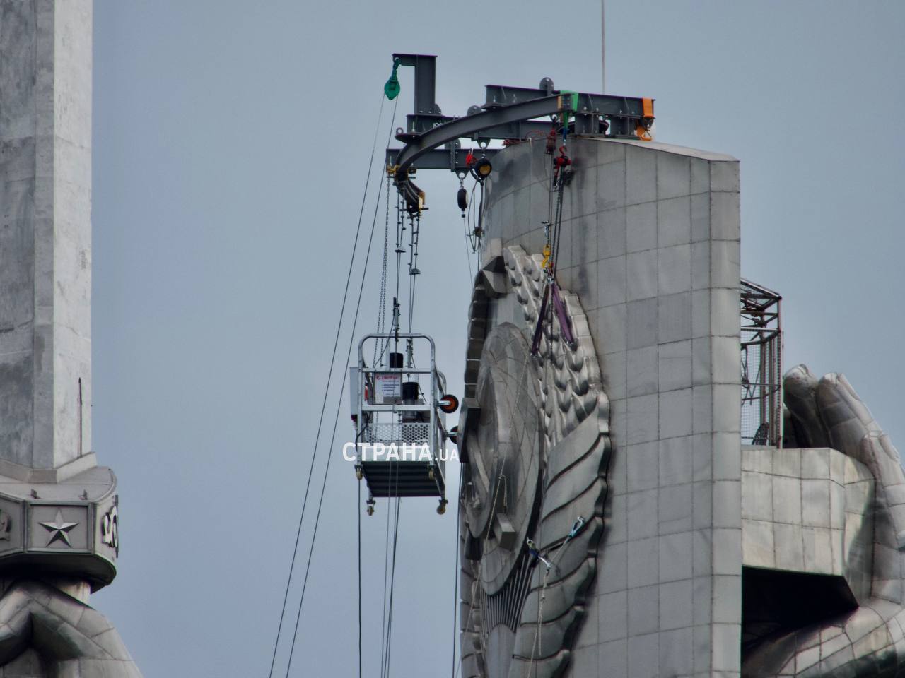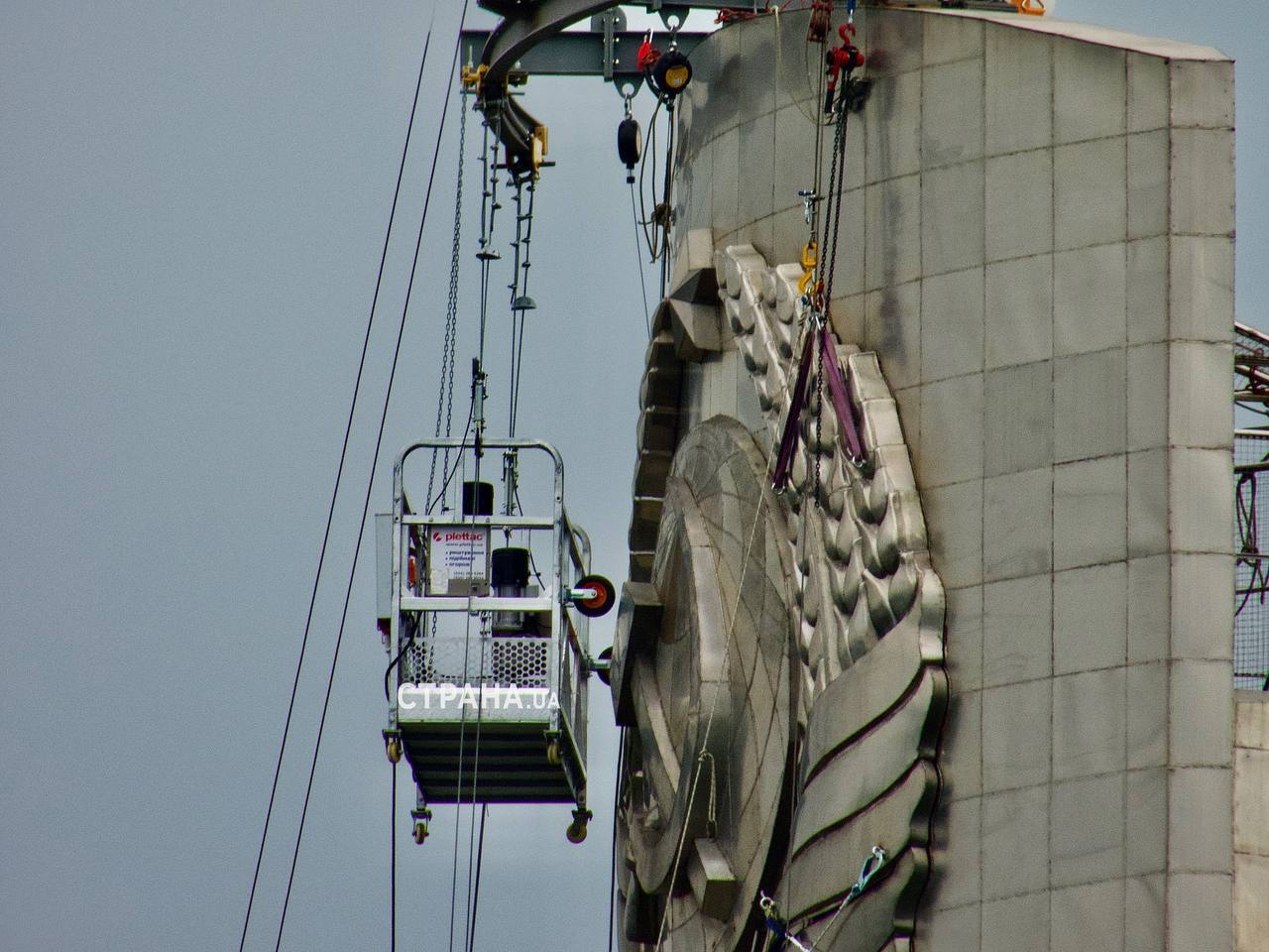 В воскресенье, 30 июля, в Киеве начался демонтаж советского герба на монументе "Родина-Мать".
