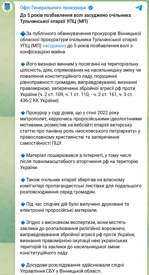 В сообщении не указано имя подсудимого, но речь идет о Винницком митрополите Ионафане. Он признан виновным в посягательстве на территориальную целостность и оправдании агрессии РФ.