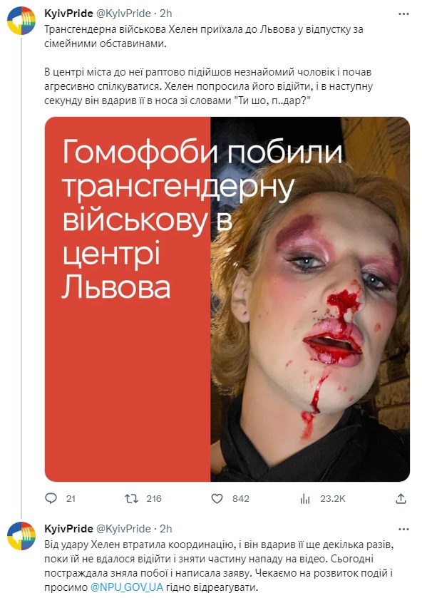 "Ты шо, п@дор?" В центре Львова мужчина избил трансгендерную военную по имени Хелен. Видео