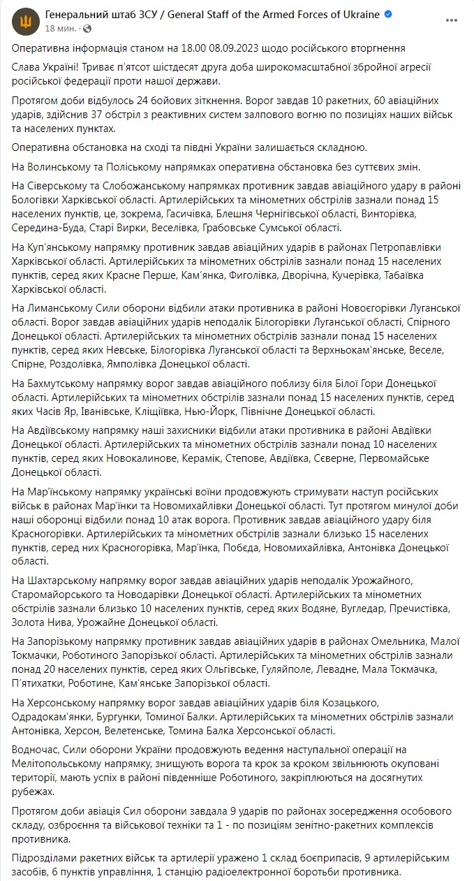 Генштаб ВСУ опубликовал оперативную информацию о российском вторжении по состоянию на 18:00 8 сентября.
