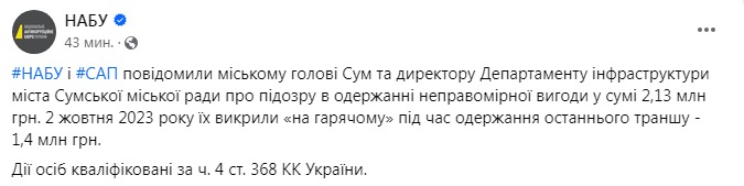 НАБУ и САП сообщили городскому главе Сум Александру Лысенко и директору Департамента инфраструктуры города Сумского городского совета о подозрении в получении неправомерной выгоды в сумме 2,13 млн грн. 2 октября их поймали на горячем при получении последнего транша взятки – 1,4 млн грн.