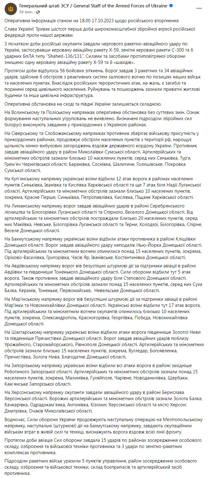 Во вторник, 17 октября, в Украине идет 601-й день войны с Россией.