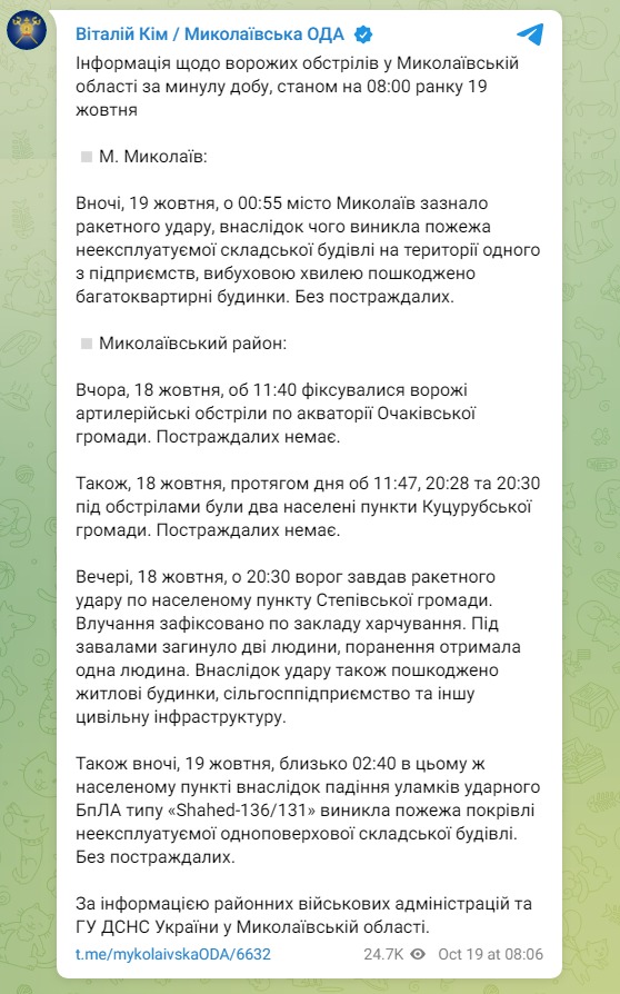 Вечером 18 октября был ракетный удар по населенному пункту Степовской общины. Попали по заведению питания, под завалами погибли два человека, один ранен. Также повреждены жилые дома, сельхозпредприятие и другая инфраструктура.