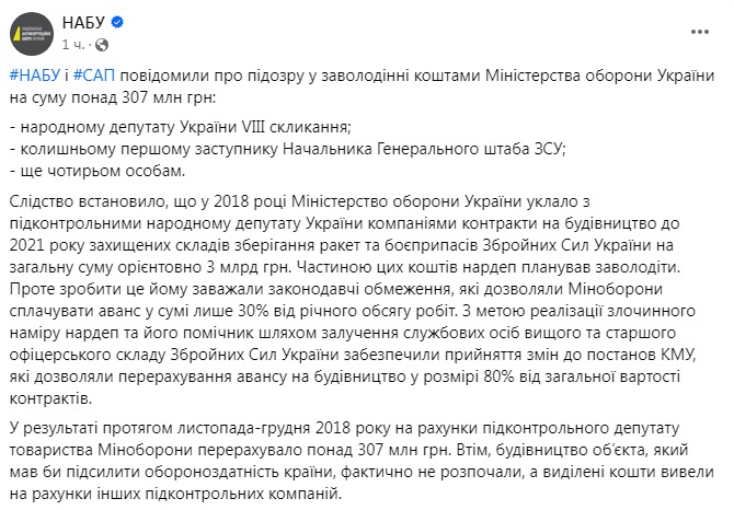 Национальное антикоррупционное бюро Украины (НАБУ) сообщило о подозрении экс-нардепу и бывшему первому заместителю главы Генштаба по делу о хищении 307 миллионов гривен при строительстве складов для хранения ракет и боеприпасов ВСУ.