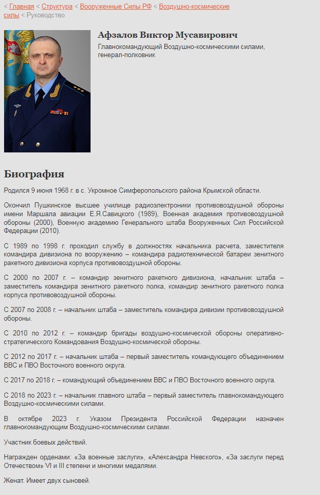 "В октябре 2023 г. указом президента Российской Федерации назначен главнокомандующим Воздушно-космическими силами. Участник боевых действий", — говорится в биографии на сайте ведомства.
