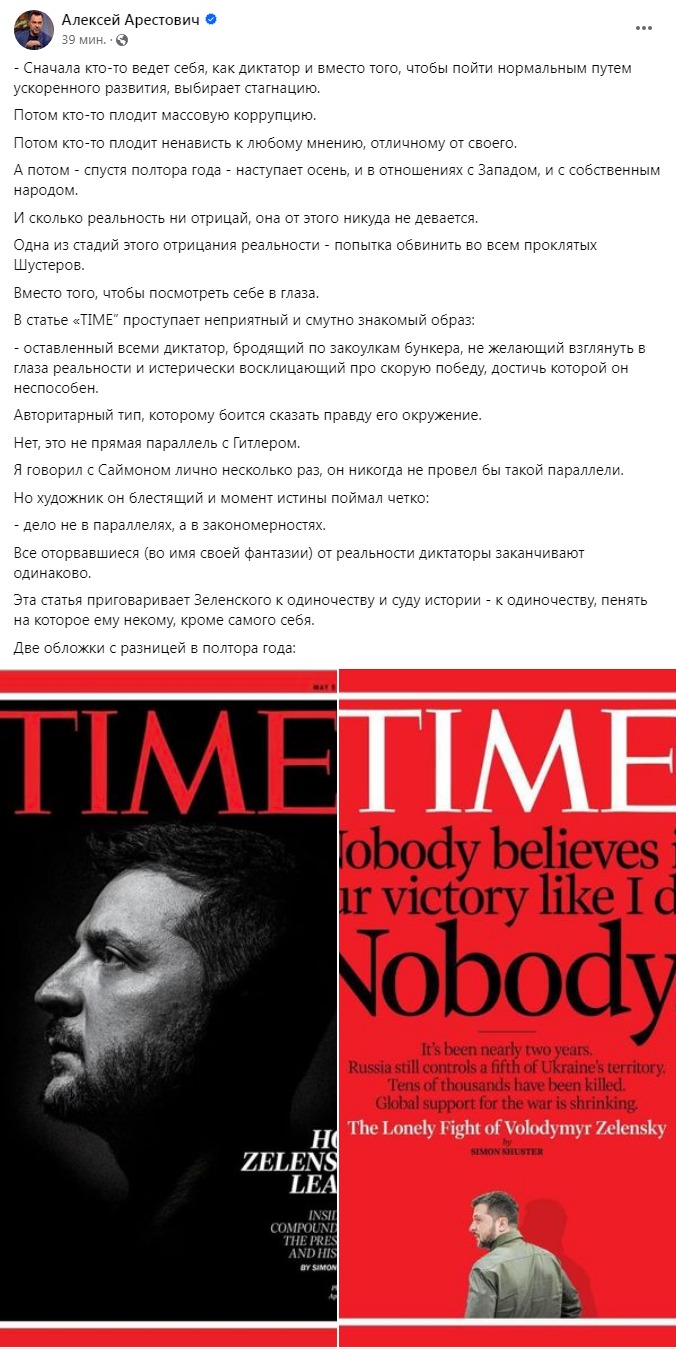 Что касается самой статье в Timе, то Арестович охарактеризовал ее так: "Саймон Шустер мастерски рисует в своей статье для Timе неприятный и смутно знакомый образ: оставленный всеми диктатор, бродящий по закоулкам бункера, не желающий взглянуть в глаза реальности и истерически восклицающий про скорую победу, достичь которой он неспособен. Авторитарный лидер, которому боится сказать правду его окружение. Нет, это не прямая параллель с Гитлером. Я говорил с Саймоном лично несколько раз, он никогда не провел бы такой параллели".