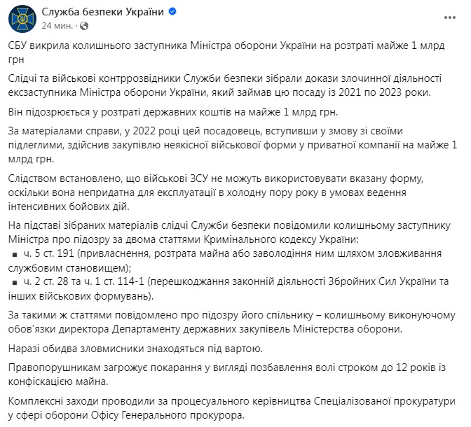 "Следователи и военные контрразведчики Службы безопасности собрали доказательства преступной деятельности экс-заместителя министра обороны Украины, занимавшего этот пост с 2021 по 2023 годы. Он подозревается в растрате государственных средств почти на 1 млрд грн. По материалам дела, в 2022 году это должностное лицо, вступив в сговор со своими подчиненными, осуществило закупку некачественной военной формы у частной компании на почти 1 млрд грн. Следствием установлено, что военные ВСУ не могут использовать указанную форму, поскольку она непригодна для эксплуатации в холодное время года в условиях ведения интенсивных боевых действий", - сказано в посте.