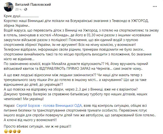 В Ужгороде военкомы ночью насильно увели в ТЦК водителя автобуса, который привез детскую команду из Винницы на спортивные соревнования по тхэквондо.