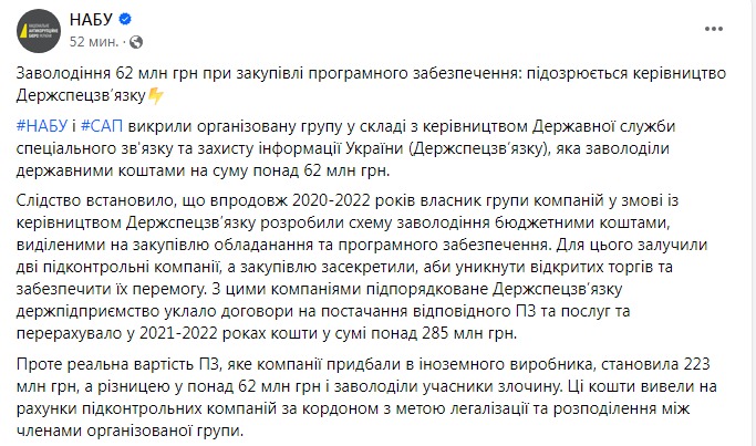 В посте сказано, что НАБУ и Специализированная антикоррупционная прокуратура (САП) разоблачили организованную группу в составе с руководством Государственной службы специальной связи и защиты информации Украины, которая завладела государственными средствами на сумму более 62 млн грн.