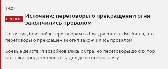 "Источник, близкий к переговорам в Дохе, рассказал Би-би-си, что переговоры о прекращении огня закончились провалом. Боевые действия возобновились с утра, но переговоры до сих пор все-таки продолжались в надежде на новую паузу", - сказано в сообщении.
