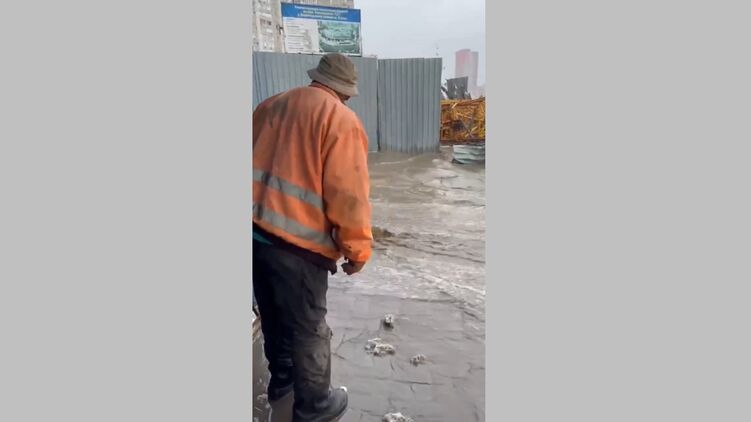 Трубу прорвало раньше, чем упал кран. Скриншот видео