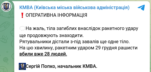 Число мирных жителей, погибших в Киеве от российского обстрела 29 декабря 2023 года увеличилось до 28 человек.