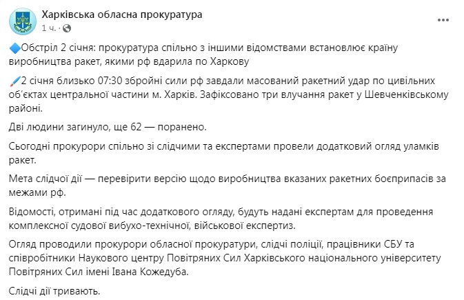 Между тем Харьковская областная прокуратура заявила, что 2 января РФ могла ударить по Харькову северокорейскими баллистическими ракетами.