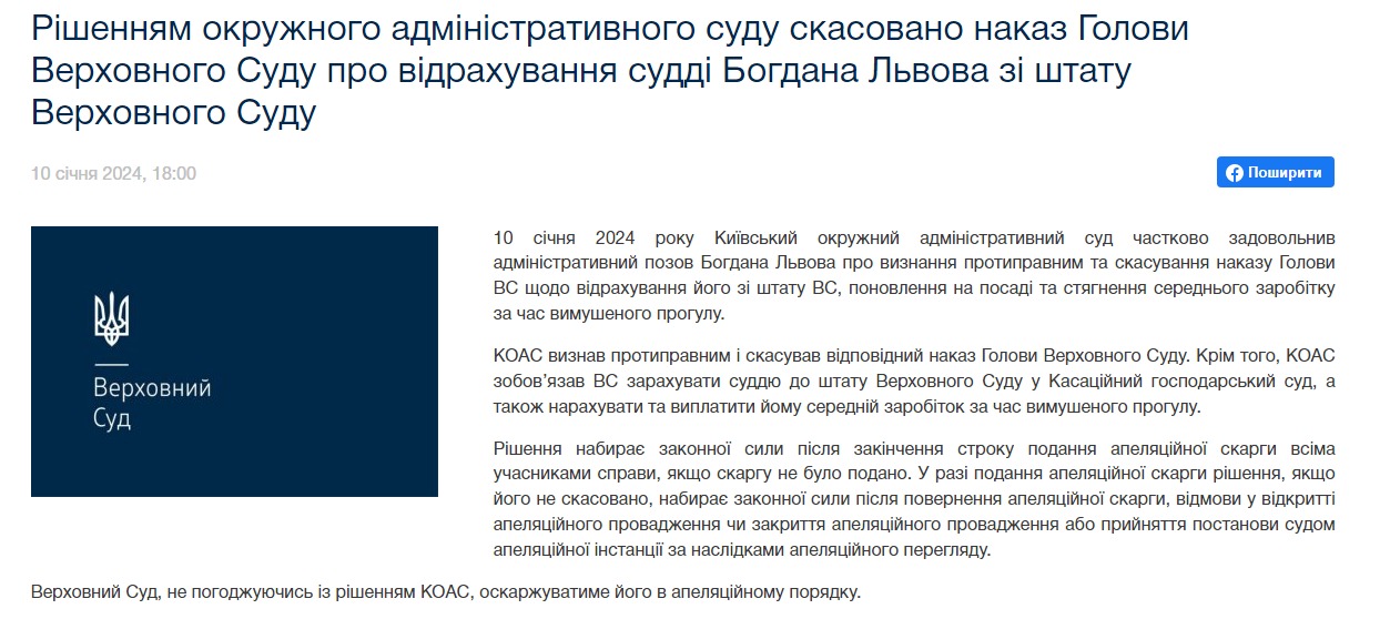 Верховный суд заявил, что обжалует решение Киевского окружного админсуда.