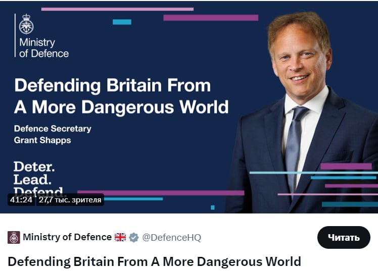 Об этом заявил министр обороны Британии Грант Шэппс в выступлении, транслировавшемся в соцсети Х (ранее Twitter).