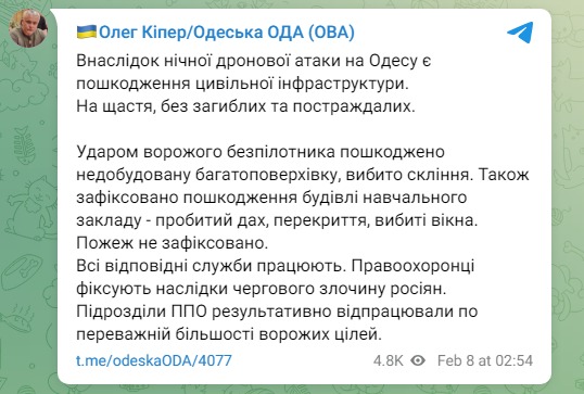 "Ударом вражеского беспилотника повреждена недостроенная многоэтажка, выбито остекление. Также зафиксировано повреждение здания учебного заведения - пробита крыша, перекрытия, выбиты окна. Пожар не зафиксирован", - написал Кипер.