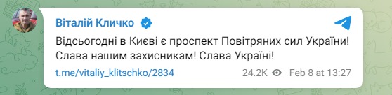 "За такое название выступают киевляне, выступает руководство Генштаба и ГУР, наши военные. Есть обращение от них. И этот вопрос мы уже обсуждаем давно. Поэтому считаю, что пора уже поставить точку. И предлагаю наконец принять этот вопрос. Воздушные силы ежедневно и каждую ночь защищают небо, сбивают дроны и ракеты, летящие на украинские города и села. И наши защитники заслуживают того, чтобы выразить им уважение и благодарность", - заявил на заседании Кличко.