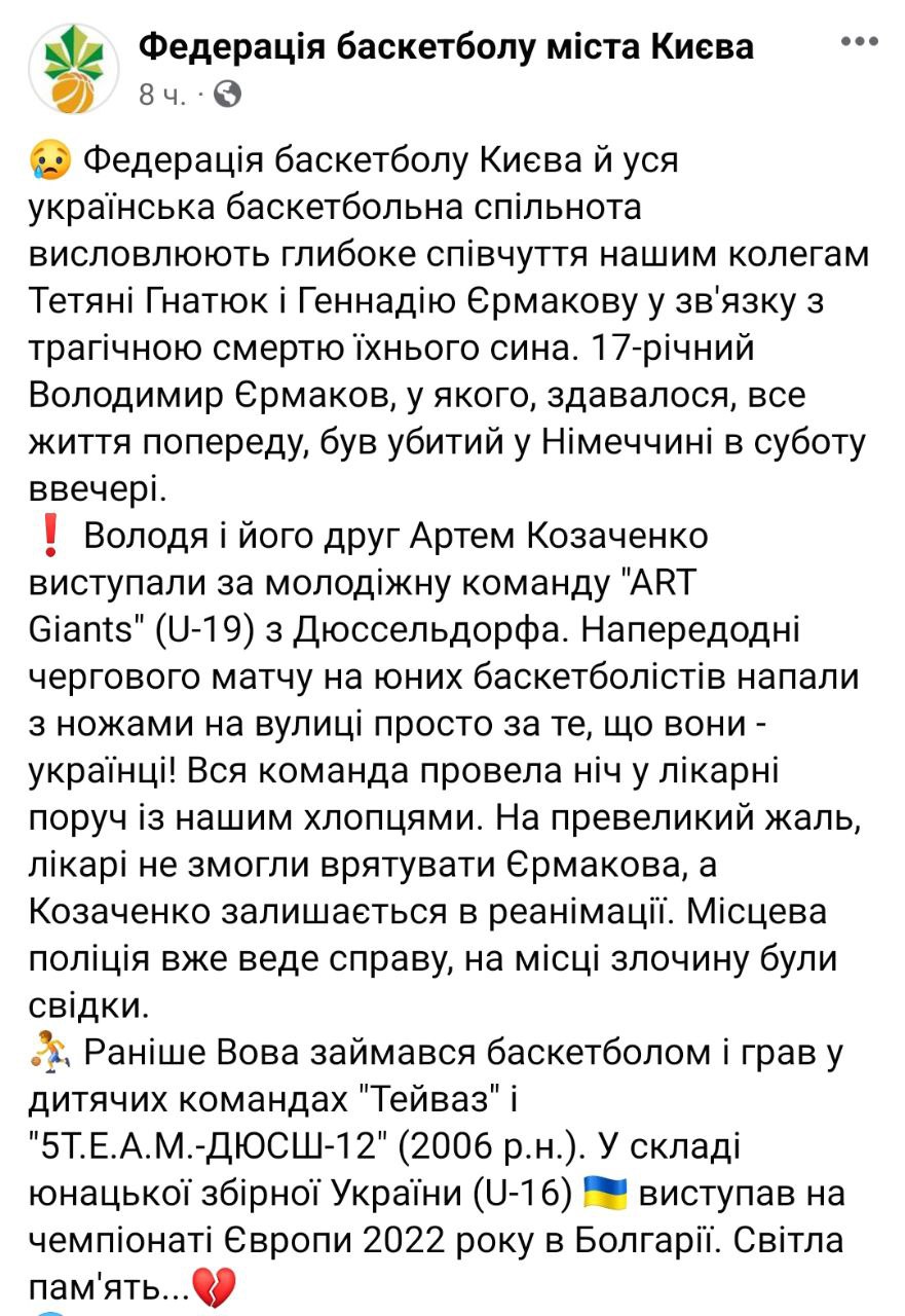 Федерация баскетбола Киева добавляет, что Ермаков был зарезан группой неизвестных, которая атаковала его и еще одного украинского баскетболиста - Артема Козаченко. Он сейчас в реанимации.