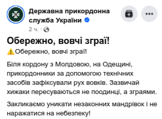 "У границы с Молдовой, в Одесской области, пограничники с помощью технических средств зафиксировали передвижение волков. Как правило, хищники передвигаются не поодиночке, а стаями. Призываем избегать незаконных путешествий и не подвергать себя опасности", - предупреждает ГПСУ, показывая видео с волчьей стаей.