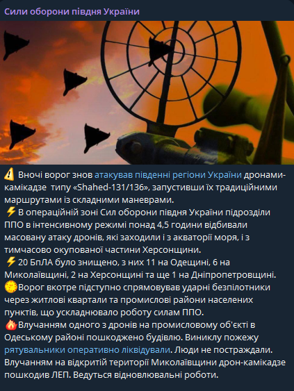 ВСУ уничтожили 11 Шахедов в Одесской области. Поврежден промышленный объект