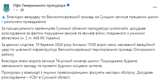 По данным следствия, 19 марта 2024 года около 15:00 враг нанес массированный авиационный удар по гражданской инфраструктуре Великописаревской территориальной громады Ахтырского района.