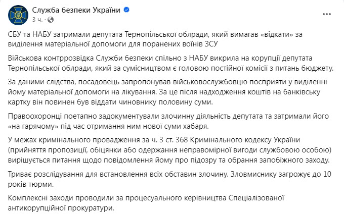 Служба безопасности Украины (СБУ) и Национальное антикоррупционное бюро (НАБУ) разоблачили на коррупции депутата Тернопольского облсовета Олега Щиголя, который по совместительству является председателем постоянной комиссии по бюджету. По данным следствия, депутат требовал откат за выделение материальной помощи для раненых воинов ВСУ.