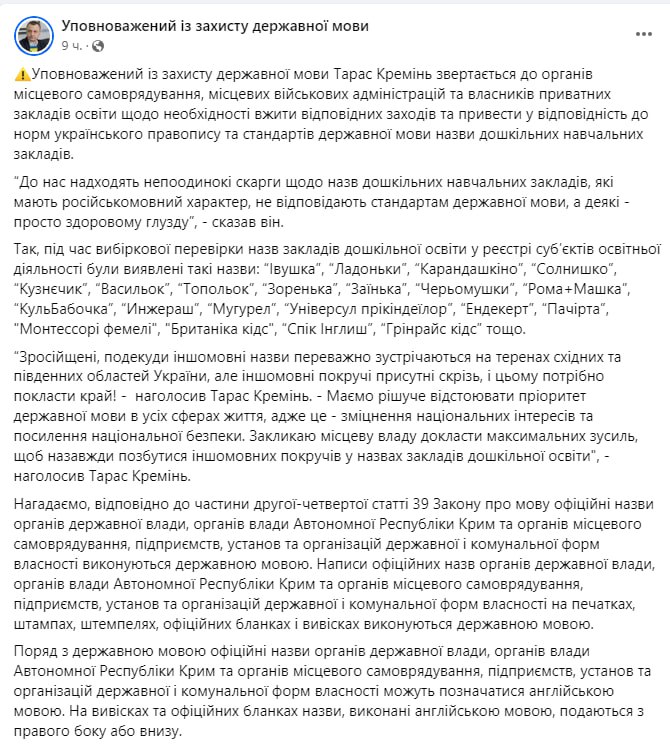 Кремень обратился в органы местного самоуправления, местные военные администрации и к владельцам частных детсадов по поводу необходимости привести в соответствие с нормами украинского правописания и стандартами госязыка названия дошкольных учебных заведений.