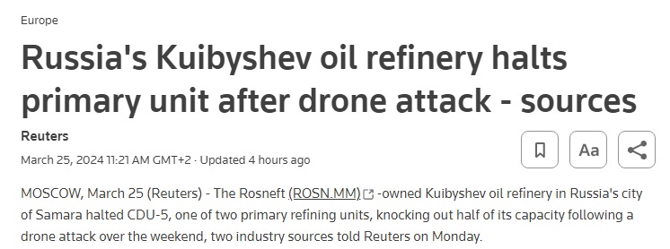 Куйбышевский нефтеперерабатывающий завод в Самарской области РФ потерял половину нефтепереработки после атаки беспилотников и пожара 23 марта.