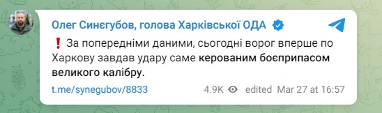 Его предположение подтвердили в ОВА. По данным администрации, предварительно, по Харькову сегодня был впервые нанесен удар управляемым боеприпасом крупного калибра.