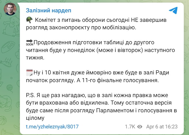 Между тем нардеп из "Голоса" Ярослав Железняк написал в Телеграм, что комитет по вопросам национальной безопасности, обороны и разведки сегодня не завершил рассмотрение законопроекта о мобилизации.