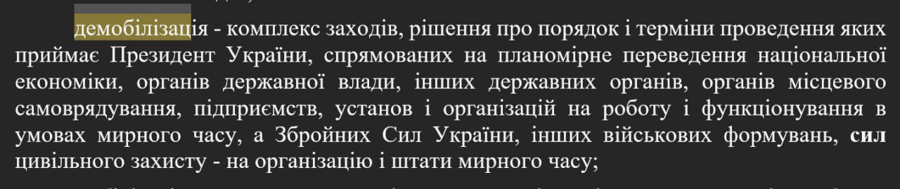 "Демобилизация - комплекс мер, решение о порядке и сроках проведения которых принимает президент Украины, направленных на планомерный перевод национальной экономики, органов государственной власти, других госорганов, органов местного самоуправления, предприятий, организаций на работу в условиях мирного времени, а Вооруженных сил Украины, других военных формирований, сил гражданской обороны - на организацию и штаты мирного времени", - гласит текст.