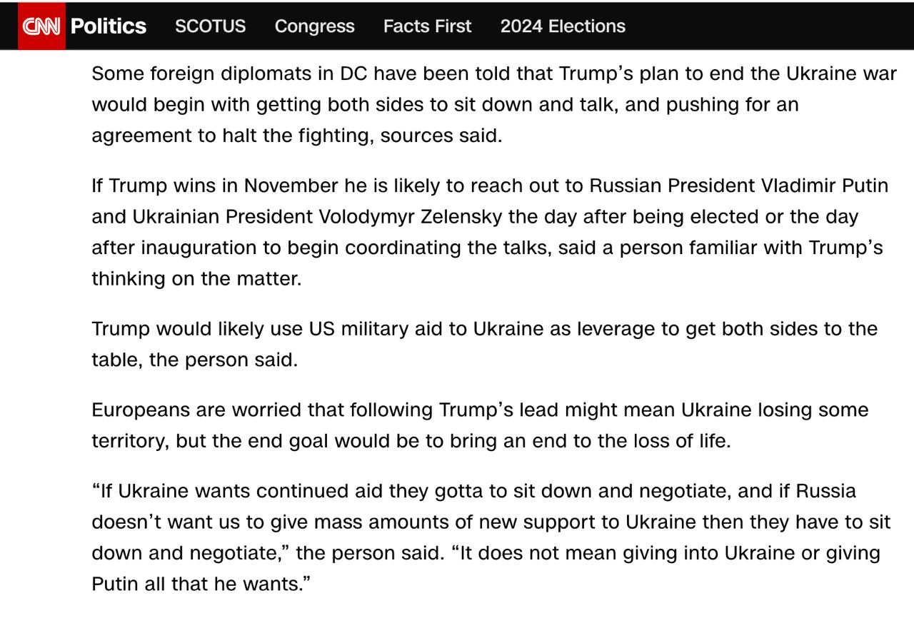 "Если Украина хочет продолжения помощи, то она должна сесть и договориться, а если Россия не хочет, чтобы мы оказывали Украине новую массовую поддержку, то они должны сесть и договориться. Это не значит, что нужно уступать Украине или давать Путину все, что он хочет", - заявил источник издания.