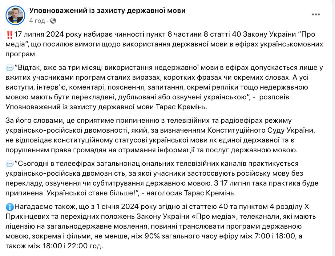 Он заявил, что 17 июля вступает в силу пункт 6 части 8 статьи 40 закона "О медиа", которая ужесточает требования по использованию государственного языка в эфирах украиноязычных программ. По словам омбудсмена, после 17 июля использование негосударственного языка в эфирах допускается только в принятых участниками программ устойчивых выражениях, коротких фразах или отдельных словах.