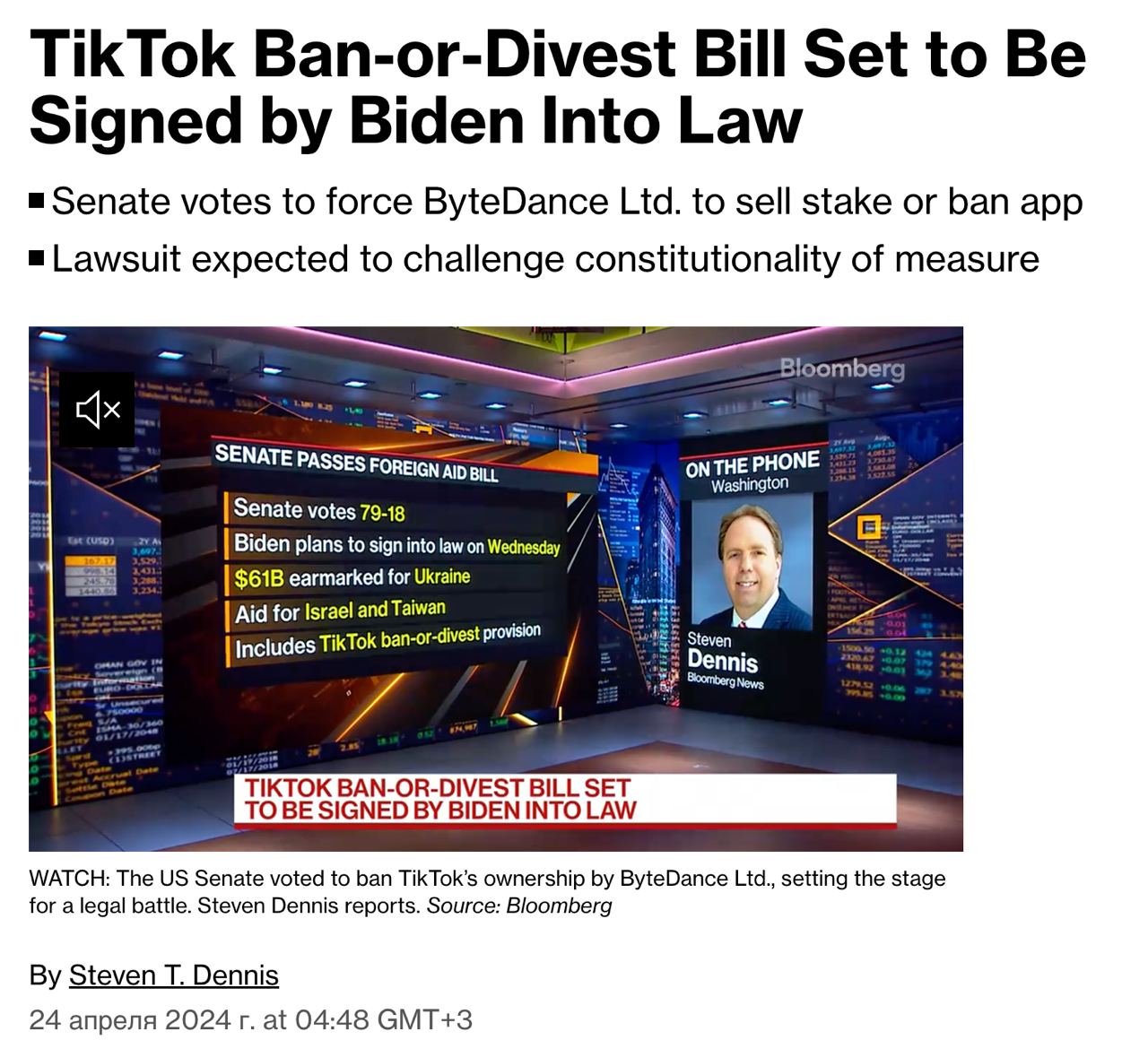 Китайской материнской компанией ByteDance запретили владеть ТикТоком. Ей дают почти год на то, чтобы продать актив, иначе приложение будет запрещено в США.