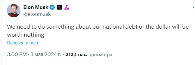 "Нам нужно что-то делать с нашим государственным долгом, иначе доллар ничего не будет стоить", – написал миллиардер.