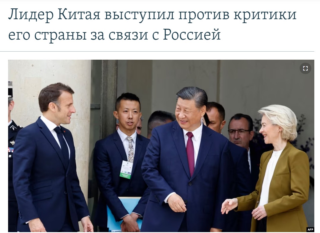 Президент Франции Эмманюэль Макрон совместно с главой Еврокомиссии Урсулой фон дер Ляйен, которая присутствовала на части переговоров с Си Цзиньпином в Париже, призвали главу КНР использовать своё влияние на Москву, чтобы положить конец войне России против Украины.